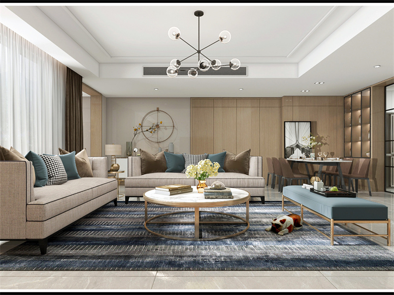 开放式布局拉通区域联动,细节上,造型灯具、软装肌理与景观采光的适配,强化生活质感。