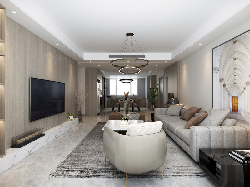 开放式布局拉通区域联动,细节上,造型灯具、软装肌理与景观采光的适配,强化生活质感。