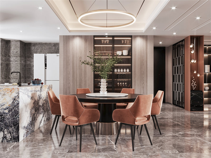 开放式布局拉通区域联动,细节上,造型灯具、软装肌理与景观采光的适配,强化生活质感。