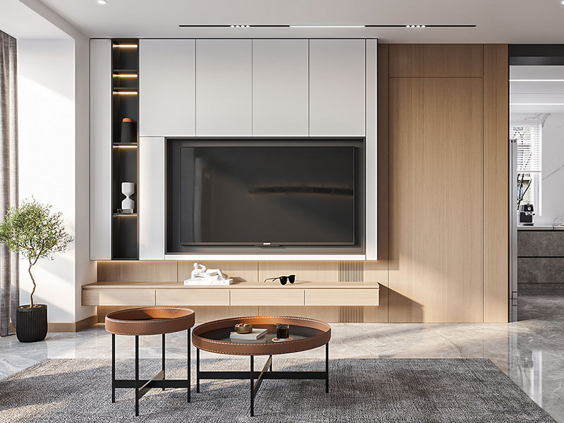 随着居住时间的增加,空间的储物压力也是在增加的,所以在装修房子时要尽可能融入收纳设计。可以考虑做收纳式电视背景墙,放置电视机的同时,也能丰富空间储物功能。