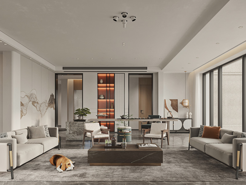 本案聚焦新中式风格,以木色为核心色调,搭配中性色与金属细节。空间中中式对称美学与现代简约设计碰撞,文化摆件与质感材质呼应,既满足社交、休憩、收纳等多元功能,又传递东方雅致格调,诠释传统与现代交融的居家美学。