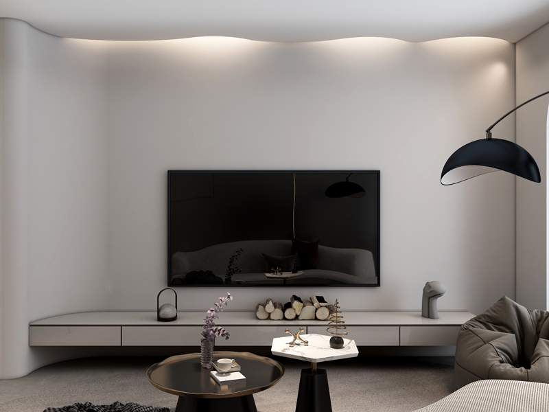 简洁大气的背景墙搭配悬空电视柜,成就客厅空间的简约气质 ,异形灯光设计赋予空间别样韵味。