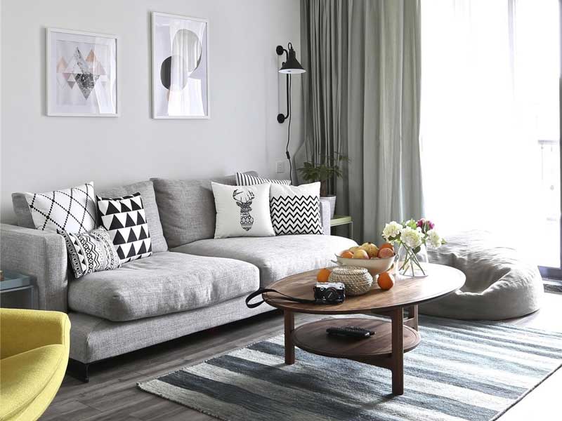 客厅以浅色为基底进行设计,轻硬装重软装的设计更符合居住需求,灰调的沙发搭配木质茶几与地板自然舒适。