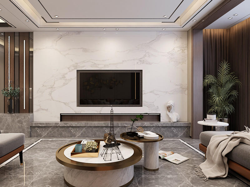 电视背景墙与地砖在材质上形成视觉呼应,纹理为空间增添流动感,搭配简洁风家居软饰,诠释现代家居的时尚惬意。