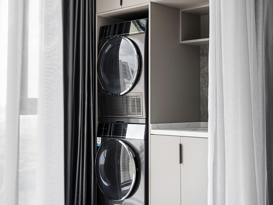 3、如果阳台需要放洗衣机的话,可以选择安装一个洗衣机一体柜,看上去整洁又很实用。