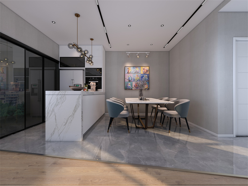 在用餐区与烹饪区之间融入吧台,呈现开放式西厨,丰富空间的储物能力和操作台面,同时不影响居室的宽阔感。