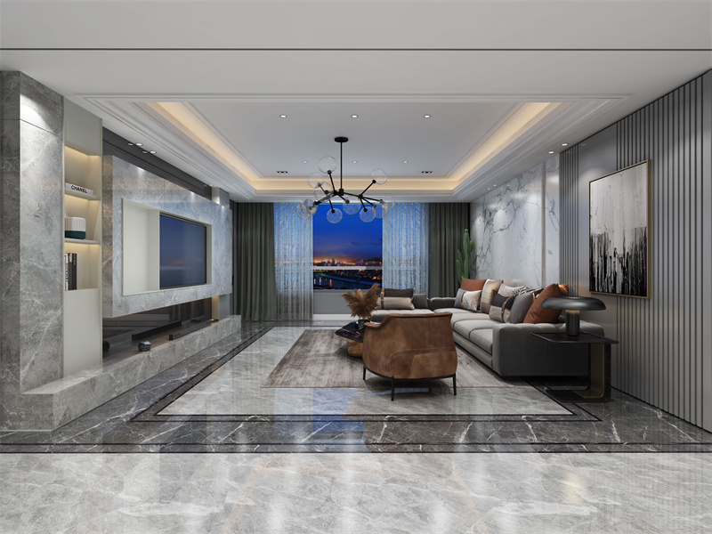 于石材电视墙中融入储物设计,摆放书籍、摆件或者绿植等,丰富空间实用性的同时,也进一步彰显居室的艺术时尚格调。