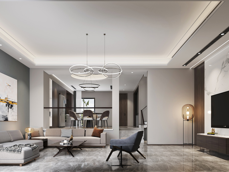 开放式布局拉通区域联动,细节上,造型灯具、软装肌理与景观采光的适配,强化生活质感。