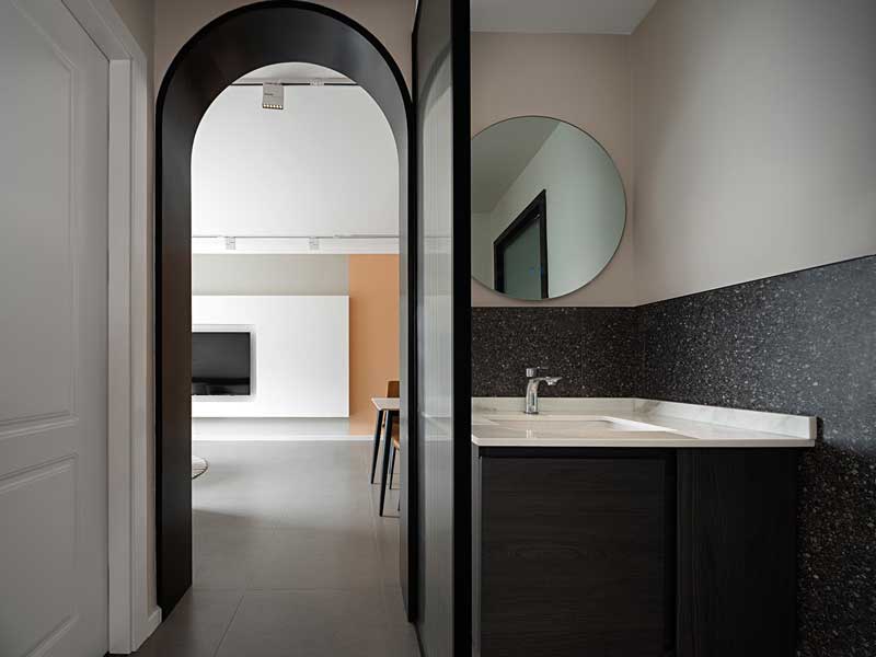卫生间区域干湿分离布局,采用洗手台外置设计,独立分区生活更便捷,黑白搭配更显稳重简约。