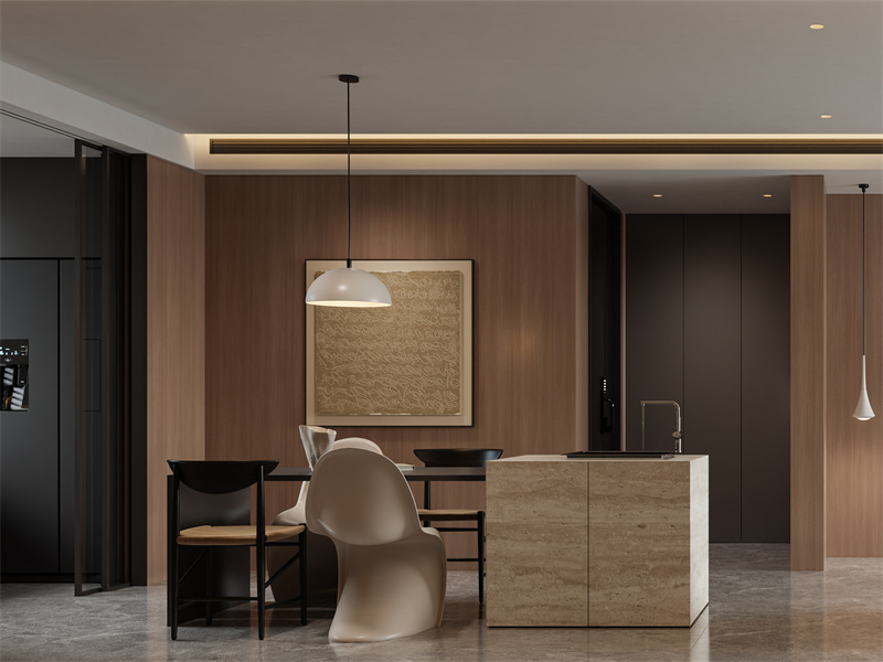 木色背景基础搭配石材中岛台,平衡温润与硬朗,简约吊灯、艺术挂画,注入轻量装饰,惬意和谐。