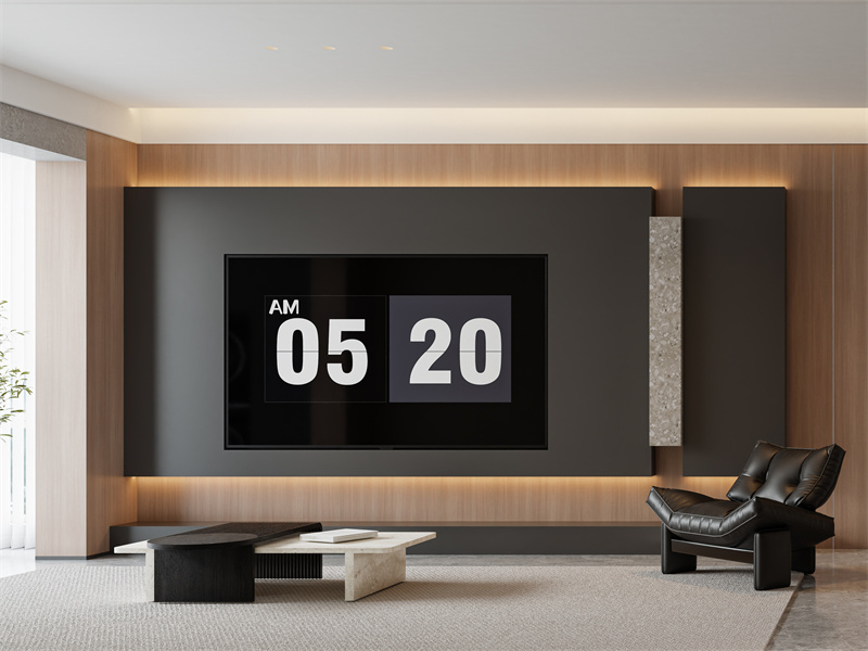 客厅电视墙以黑与木色搭配,沉稳大气,灯带融入打造悬空设计增添轻盈感,提升氛围,整体色彩简洁,营造舒适宁静的会客氛围。