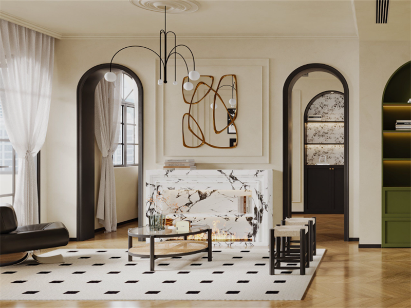 浅色调的墙面与独特的拱形门洞设计,营造出开阔且优雅的氛围。造型别致的吊灯与艺术感十足的装饰镜相互映衬,大理石纹理的壁炉区域成为视觉焦点。