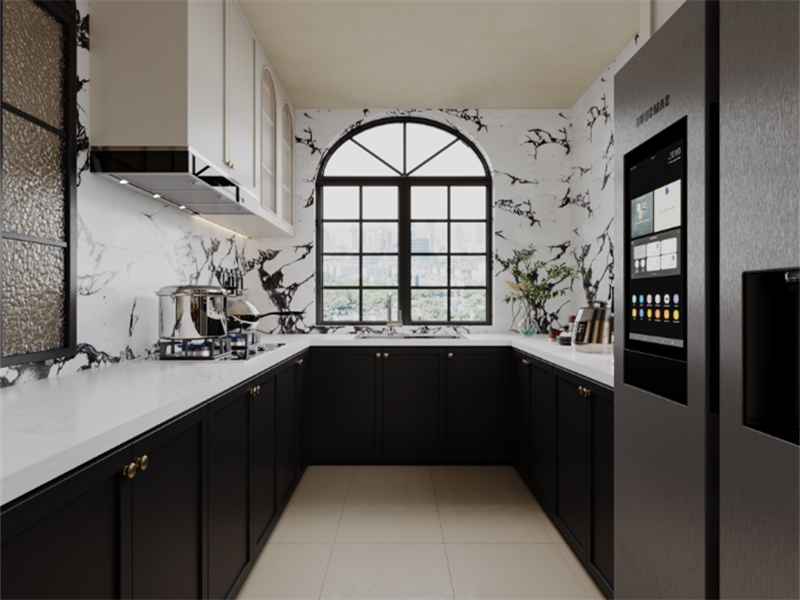 采用黑白对比的色调,大理石纹理墙面与台面,搭配深色的橱柜,彰显出轻奢感。拱形窗户引入充足自然光,让空间显得通透敞亮,更具创意感。