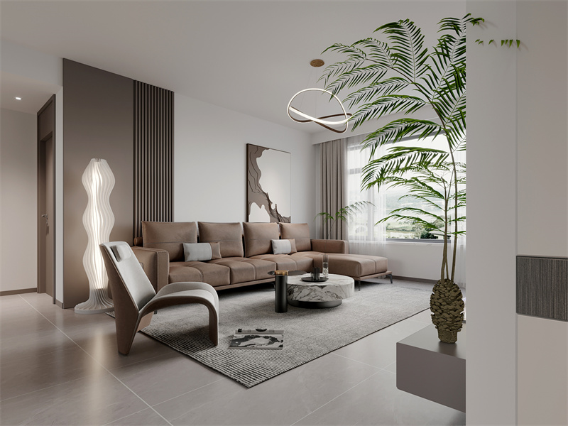 白与灰棕交织出简洁氛围,艺术感吊灯、弧形单椅尽显现代利落,大理石茶几与线性灯光提升精致度。休闲观影或待客时,简洁布局与绿植结合,传递出松弛又具格调的互动氛围,诠释现代生活的雅致随性。