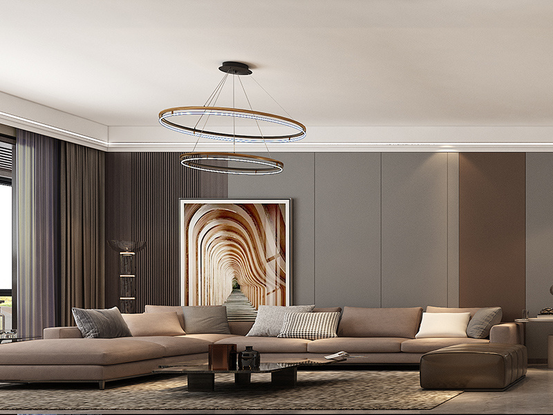 白与深棕形成简洁对比,大理石电视墙、利落柜体搭配环形吊灯,空间开阔通透。日常休闲或待客时,线条利落的家具与柔和光线交融,既传递出现代风格的干练雅致,又营造出松弛舒适的互动氛围。