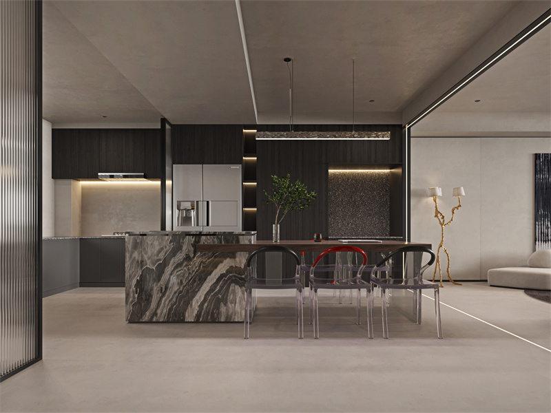 深灰、水泥色奠定侘寂质朴基调,大理石岛台、透明餐椅混搭金色艺术灯,材质对比强烈。烹饪用餐时,既具侘寂的自然粗犷,又借现代家具与艺术灯营造轻奢社交感,适配烟火烹饪与品质小聚。