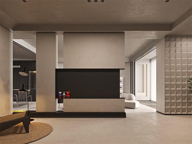浅灰与黑色碰撞,水泥质感墙面、几何造型显侘寂质朴,潮玩摆件注入现代个性。观影或展示时,既借侘寂的简约粗犷打造视觉焦点,又以潮玩细节展现混搭趣味,是兼具功能与个性表达的空间节点。