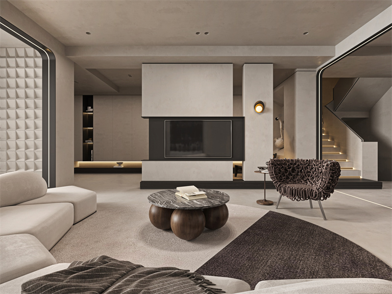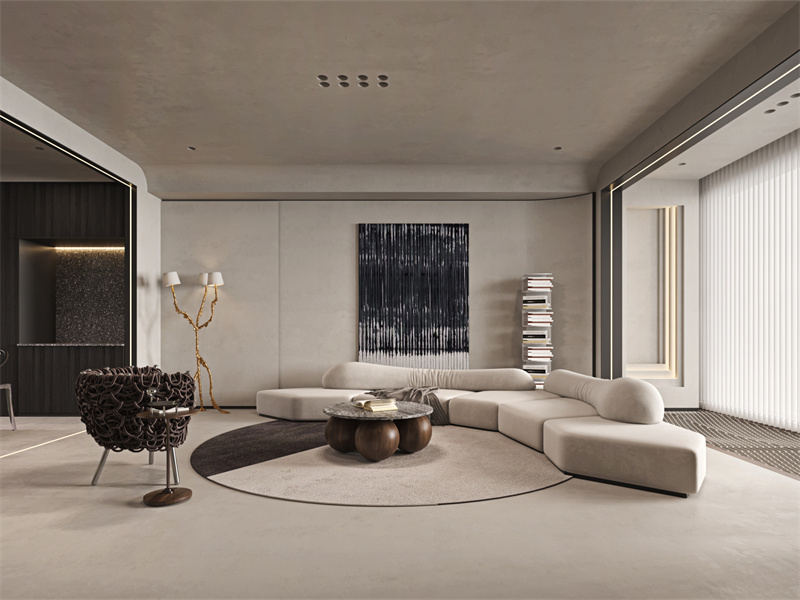 浅灰、米色为底,水泥墙显侘寂质朴,弧形沙发、编织椅混搭抽象艺术画,空间开阔松弛。日常休闲社交时,既享侘寂的慵懒随性,又因艺术软装传递现代艺术感,是融合自然与审美于一体的互动场域。