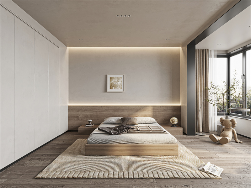 米棕与木色为主调,自然木质床具、编织地毯传递质朴感,潮玩摆件注入现代趣味。日常休憩时,既享侘寂的宁静松弛,又因艺术化软装增添个性,是兼具治愈与审美表达的私域空间。
